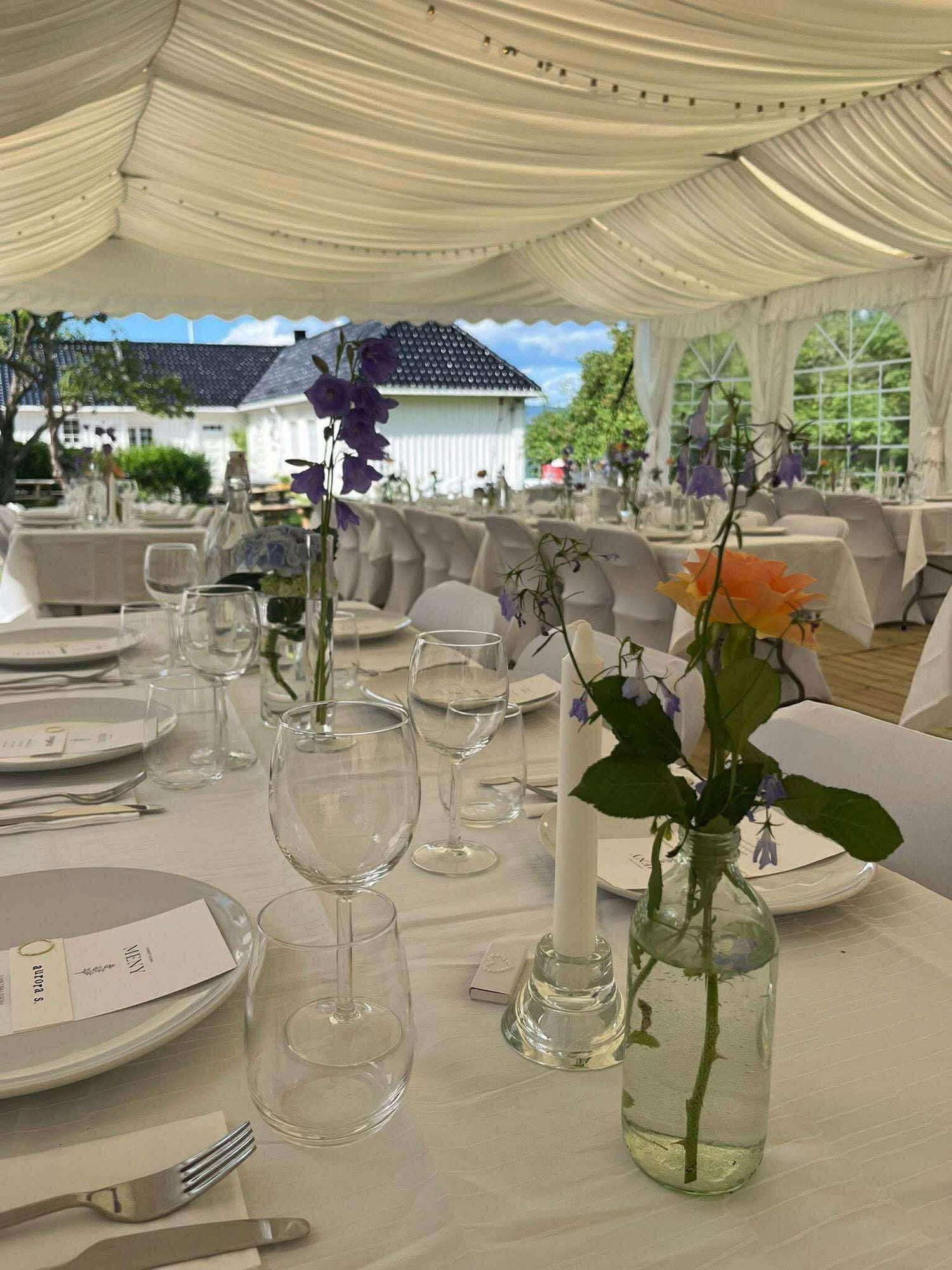 Vi leide et telt, størrelse 5x8 meter, til bryllup for 46 gjester med bord, stoler og 2 partycooler'e.